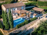 The central part of the garden is thus occupied by the swimming pool and a larger sunbathing area, next to the swimming pool there is a summer kitchen with a stone grill hidden in the natural shade of the vines.