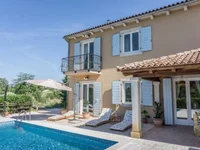On the ground floor of the villa, there is a larger living area, designed as an open and airy area of the villa, where you have the opportunity to stay in a comfortable living room, and a modern and fully equipped modern kitchen with a dining area sufficient for the whole family. What adorns this part of the villa's ground floor is a larger wood-burning fireplace that is used to heat the space, and which also creates a special atmosphere during your stay in the villa. We must not forget to mention that from the same area there is a view as well as an access to the garden and swimming pool with sunbathing area. In addition to everything mentioned, we must point out that on the ground floor of the villa, next to the living room, there is the first bedroom with its own bathroom, then a slightly separate guest toilet and laundry room.