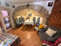 On the ground floor, there is a unique dining area that exudes authentic Mediterranean charm, thanks to the dominant stone arch. The carefully crafted and arranged stone gives a sense of security and historical value, reminiscent of old wine cellars. Alongside it are two fully equipped kitchens, a hallway, a modern bathroom, and a small storage room.