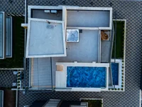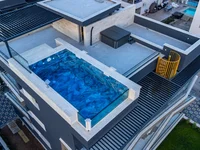 C'est le seul appartement au 2ème étage de l'immeuble. La disposition se compose d'un couloir, 3 chambres, dont deux ont salle de bains et dressing, salle de bains, cuisine avec salle à manger et salon, buanderie et 3 terrasses couvertes. L'escalier en spirale sur la terrasse mène plus loin à une terrasse sur le toit de 140.99 m3, où il y a une piscine de 34.80 m2, jacuzzi et cuisine d'été (avec barbecue), ainsi qu'une terrasse bien exposée et douche extérieure. La surface utile totale de l'appartement avec terrasses et terrasse sur le toit est de 216,12 m2