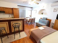 Les meubles sont inclus dans le prix. Année de construction 1991. Réparation en 2018. La façade a été rénovée, une nouvelle isolation a été posée sur les terrasses et les dalles de pierre. Construction faite de brique bloc thermique. Le toit est incliné. Fenêtres en bois avec volets. Les sols sont des carreaux dans les salles de bains et dans la cuisine, le reste est parquet. Climatisation dans un appartement de type studio. Des convecteurs muraux électriques sont installés pour le chauffage. La suite studio a une cheminée.