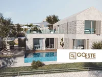 Le complexe de dix villas en pierre modernes avec piscine est situé sur la colline. Chaque villa se compose d'un rez de chaussée et d'un premier étage. Le rez-de-chaussée de 102,84 m2 se compose d'une cuisine ouverte avec salle à manger et salon, un cellier, un WC et une chambre principale avec une salle de bains et une armoire. Depuis le salon, les murs coulissants permettent la communication avec l'espace extérieur, et à l'intérieur de la pièce offrent une vue impressionnante sur la mer. La surface extérieure de 138,79 m2 est enrichie d'une piscine de 22,42 m2, chaises longues, cuisine d'été, terrasse couverte avec un coin repas extérieur et une terrasse extérieure de 42,49 m2. Les escaliers intérieurs mènent au premier étage de 105m2 avec une terrasse. Au premier étage il y a trois chambres avec salles de bains et une terrasse couverte de 37 m2.