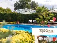 Il y a une belle terrasse devant la maison. La cour est bien entretenue et bien entretenue, pleine de plantes et d'oliviers. Dans la cour il y a une piscine avec eau salée, un lieu de bain de soleil et une cuisine d'été avec cheminée, ainsi qu'un espace couvert pour les rassemblements sociaux.