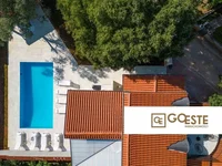 Dans le jardin de la maison il y a une cuisine d'été avec barbecue, une terrasse avec une belle table en pierre et une piscine chauffée qui crée un endroit idéal pour les loisirs et les rassemblements sociaux.