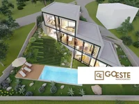En face de la maison est un beau jardin et piscine qui offre une intimité complète. La piscine et la terrasse bien exposée offrent une intimité totale car ils sont en dessous du niveau de la rue. Les portes en verre du sol au plafond à tous les niveaux permettent à la lumière naturelle de remplir toutes les pièces, tout en ouvrant l'espace à la nature environnante et belle vue sur la mer. Les places de parking sont situées au rez-de-chaussée.