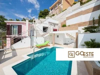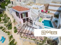 Devant la maison il y a une piscine d'où vous pourrez profiter d'une vue magnifique sur la mer et les îles. En plus de la piscine, il y a une zone de bain de soleil de 20 m2 à l'extérieur de la maison basse. Il y a aussi une galerie au-dessus de la piscine de 6 m2 et une zone de grillage de 12 m2. Toutes les zones extérieures entourant la petite maison sont d'environ 120 m2. Il est possible de construire une autre maison avec 4 étages.