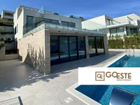 Le premier étage se compose de deux chambres, dont l'une a une salle de bains, deux salles de bains, un cellier et un salon ouvert et une cuisine avec un coin repas de 84 m2 avec un grand mur coulissant en verre menant à une grande terrasse. La terrasse offre une vue dégagée sur la mer, dispose d'une piscine chauffée de 11 m de long avec une terrasse ensoleillée et des meubles de jardin, grâce à une fenêtre en aluminium du sol au plafond, la vue imprenable sur la mer reste en vue, même si vous êtes debout dans le salon. L'ascenseur mène au deuxième étage, où il y a une buanderie, trois chambres avec salles de bains, une chambre avec un grand mur coulissant en verre a accès à une grande terrasse avec un coin repas extérieur, un jacuzzi et une terrasse bien exposée. Au troisième étage il y a un garage pour deux places de parking et une autre place de parking couverte à l'extérieur.