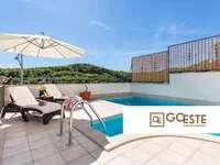 Au premier étage il y a un appartement composé de deux chambres, deux salles de bains, une cuisine avec salle à manger, un salon et une chambre supplémentaire qui sert de compartiment de rangement. L'appartement donne sur la terrasse avec piscine chauffée. A côté de la piscine se trouve une hotte avec cheminée extérieure et meubles. La terrasse offre une vue sur la mer.