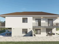 Cette maison moderne de deux étages fait partie d'une unité semi-détachée et offre une surface habitable totale de 111 mètres carrés. Le rez-de-chaussée comprend un hall d'entrée, des toilettes invités, un spacieux salon ouvert relié à la cuisine et à la salle à manger, et l'accès à une terrasse couverte. L'étage supérieur comprend un couloir, deux salles de bains et trois chambres, dont deux ont un accès direct à une terrasse couverte avec vue sur la nature environnante.