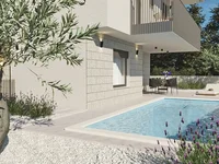 Le jardin paysager d'environ 180 mètres carrés ajoute une valeur significative à la propriété. Il comprend une piscine de 21 mètres carrés équipée d'électrolyse, d'une pompe à chaleur et d'un bain de soleil. Le style méditerranéen contemporain est souligné par les murs de bordure de pierre et les détails de pierre de bon goût sur la façade et autour de la maison.