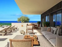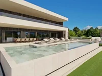 Le premier étage offre quatre chambres spacieuses, chacune avec sa propre salle de bains privative et accès à une terrasse couverte, ainsi qu'un couloir et un vestiaire, assurant un maximum de confort et d'intimité. Le jardin paysager est soigneusement aménagé avec des plantes méditerranéennes et l'éclairage ambiant, tandis qu'une piscine privée avec une zone de bain de soleil complète l'expérience de vie en plein air.