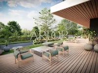 L'appartement comprend un jardin privé d'environ 124 m2 avec une piscine, deux places de parking dans le garage souterrain et une salle de stockage au sous-sol. Les résidents ont également accès à une salle de fitness commune dans l'immeuble.