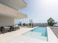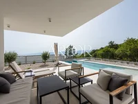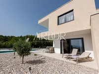 The villa is situated on an elevated position that ensures a good view and a peaceful environment in a new neighborhood surrounded by greenery. On the ground floor, there is a living room with a kitchen and dining area in an open-plan space, with access to a covered terrace and a pool. On this floor, there is also a smaller bathroom. Internal stairs lead to a spacious garage and boiler room or to three bedrooms on the upper floor. The master bedroom has its own bathroom and a walk-in closet. On the upper floor, there is another larger bathroom and a terrace with west-facing views. The property was built in 2022 and is immediately ready for occupancy by new owners.