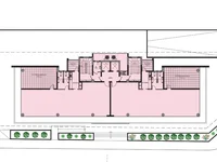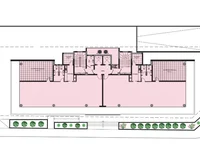 Rez-de-chaussée – hall (130 m2), commerces de détail (210 m2), 17 places de stationnement