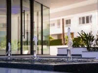 Vaste paysage et les caractéristiques de l'eau au rez-de-chaussée, des dispositions pour les jardins verticaux aux balcons.