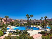 Situated on the 2nd floor, the property benefits from abundant natural light due to its corner positioning. The open-plan living and dining area connects to a fully equipped kitchen and opens onto a covered veranda overlooking the pool and garden courtyard.