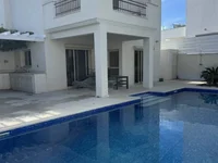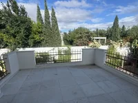 Le rez-de-chaussée dispose d'un salon et d'un coin repas ouverts, ainsi que d'une cuisine séparée entièrement équipée. Les deux zones offrent un accès direct à l'espace extérieur, menant à une grande piscine, un barbecue et un jardin magnifiquement entretenu.