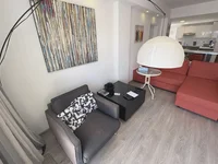 The property features two bedrooms with built-in wardrobes, one bathroom, and two balconies that allow plenty of natural light. It is fully furnished and includes a fully equipped kitchen with appliances. The apartment is fully air-conditioned in all rooms, ensuring comfort throughout the year.