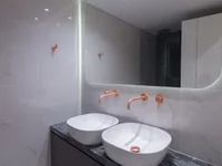 The apartment features a bespoke design with high-end finishes, including marble floors, wooden floors in the bedrooms, and an open-plan kitchen and living area. It comprises a master bedroom and two additional double bedrooms, all with en-suite bathrooms, plus a guest WC.