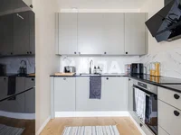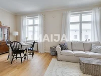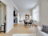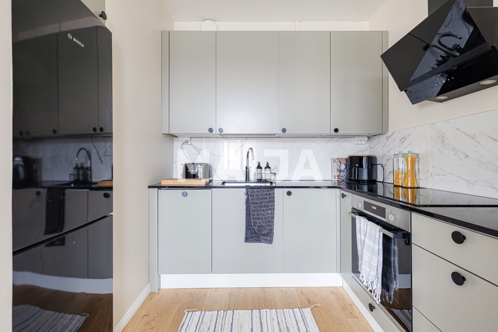 The townhouse, located on the fifth floor of the elevator building, has been renovated in 2023 and the material choices have not been spared. The kitchen is equipped with quality appliances and stone countertops. In a large bedroom, you can easily access e.g. a work desk and large cupboards provide relief for storage needs.