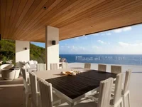 The villa has a glazed living room, dining room, chef's kitchen and five en-suite bedrooms. Two bedrooms are on the main level with terraces; three on the lower level. All bedrooms have rain showers and ocean views.