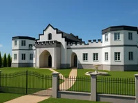 • Fenêtre avec clôture avant de style château, chemins décoratifs et plantations.