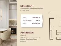 The complex consists of two 8-story buildings, providing everything for a comfortable stay. Hotel rooms and apartments with a variety of layouts are available: from studios to two-bedroom apartments, ranging from 30 sq m to 116 sq m. Apartments are delivered turnkey.