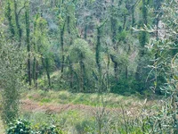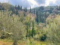 Le terrain est divisé en deux sections par une route municipale, qui offre un accès facile aux deux parties. Le terrain est varié et en partie en pente, avec une grande partie s'étendant sur la colline, offrant un sentiment d'intimité et d'harmonie avec le paysage environnant.