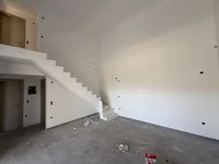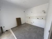 The ground floor offers a spacious living room with access to a terrace, a separate kitchen fitted with basic cabinetry (no electrical appliances), one bright bedroom, and a bathroom with a shower.