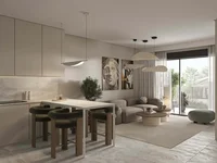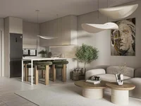 Au premier étage, l’appartement comprend deux chambres lumineuses avec de grands placards, un mobilier ergonomique et un design minimaliste raffiné, ainsi qu’une salle de bain entièrement équipée avec douche, meuble-lavabo suspendu et miroir rond. La cuisine ouverte et le salon constituent le cœur de la maison, décorés dans des tons naturels et terreux, avec un éclairage moderne et un accès direct au vaste balcon (61 m²) — idéal pour se détendre ou recevoir, tout en profitant de la vue sur l’extérieur.