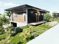 A l'étage se trouve un salon ouvert qui relie une cuisine élégante avec un espace repas et une grande terrasse pour profiter de vues tropicales, complétée par une salle de bains complète. En bas, deux chambres spacieuses partagent une salle de bains magnifiquement conçue, créant une retraite confortable. La piscine privée à l'extérieur est parfaite pour la détente et le divertissement.