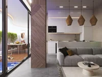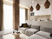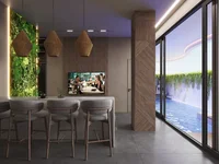 OM Apartments with a terrace and pool. Ultra -modern interior design. Apartments equipment: bed, cabinet, sofa, refrigerator, audio system in the bedroom and bathroom, TV, panoramic glazing, dining table, barbecue zone.