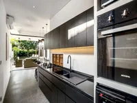 Modern kitchen (fridge, oven, microwave, wine cellar, coffee machine, dispenser, recycling bin)