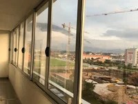 L'appartement dispose d'un salon avec une cuisine, deux chambres, deux salles de bains et une terrasse vitrée.