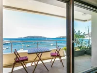 The apartment consists of a spacious living room with dining area, a terrace with direct panoramic sea view, two bathrooms, and three bedrooms.