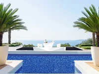 In the basement there are two en suite bedrooms with panoramic windows, access to the pool and yard, a wine cellar, as well as a connection to the garage. On the ground floor there is a spacious open-plan living room with a kitchen and dining room, a guest toilet and a large, partially covered terrace with a view of the sea. The first floor of the villa, also the last, consists of a master bedroom with an en suite bathroom, a sauna and four terraces with a view of the sea and the mountains.