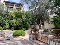 Sur le site, décoré d'éléments en marbre et de plantes exotiques, il y a une piscine de pierre beige avec des mosaïques dorées, équipées d'une cascade et d'un jacuzzi. Banc en pierre près de la piscine s'intègre harmonieusement dans l'ensemble architectural et la conception du paysage du territoire de la maison. Dans le jardin de la villa il y a un hammam et des zones de loisirs.