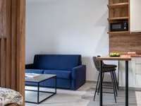 Un studio confortable, entièrement équipé de tout ce dont vous avez besoin et composé d'une pièce avec cuisine, salle à manger et coin nuit. Les fenêtres donnent sur les montagnes.
