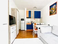 Vue de la terrasse à l'est. Appartement avec réparation de haute qualité (plastique italien décoratif), nouveaux meubles et appareils.