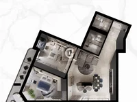 La structure de l'appartement: cuisine-séjour, 2 chambres, 1 salle de bains, terrasse.