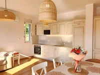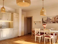 La disposition comprend 2 chambres d'une capacité totale de 5 lits, un salon avec un espace cuisine spacieux, une salle de bains équipée avec chauffage au sol, et un balcon avec vue panoramique sur la mer et la ville. Chaque chambre et salon dispose de la climatisation. Le plancher est en bois naturel. Sur les fenêtres et les portes du balcon, des stores extérieurs et des moustiquaires rétractables sont installés. L'appartement est vendu entièrement meublé, y compris tout l'équipement nécessaire. La cuisine dispose d'un four complet, d'un lave-vaisselle et d'un filtre à eau. Tous les équipements sont neufs et de haute qualité.