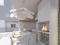 De plus, une conception conceptuelle a été préparée pour la construction d'une piscine et d'une cuisine d'été supplémentaire, présentée à travers des rendus 3D dans la vitrine de la propriété.