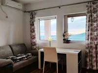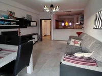 L'appartement est de 97 mètres carrés et situé au deuxième étage d'un immeuble de quatre étages. L'aménagement comprend un couloir, un salon avec un coin cuisine, deux chambres, deux salles de bains et une grande terrasse avec vue panoramique sur la mer. L'appartement est entièrement meublé et équipé d'appareils électroménagers.