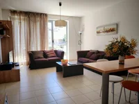 La superficie de l'appartement est de 54 m2, 2ème étage (ascenseur). Disposition: séjour avec coin cuisine, deux chambres séparées, salle de bains, grande terrasse avec vue partielle sur la mer.