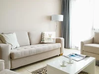 Le salon spacieux avec cuisine et coin repas offre un espace confortable pour la détente et profiter des moments quotidiens. Une grande chambre offre intimité et confort, tandis que la salle de bain moderne ajoute une touche de luxe. L'appartement est entièrement meublé avec attention au détail, et sa fonctionnalité et son design esthétique se mêlent parfaitement à l'ambiance de ce quartier attrayant.