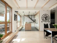 Une grande fenêtre dans le salon du côté sud fournit un très bon éclairage pour le premier niveau de l'appartement. En outre, il y a une sortie vers une grande terrasse magnifiquement paysagée (jusqu'à 23 m2), couverte d'un auvent avec télécommande.