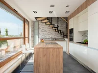 La cuisine dispose d'appareils de faible qualité: lave-vaisselle, réfrigérateur, four, plaque à induction. Il y a beaucoup d'espace de rangement, une île fonctionnelle, et tout cela correspond esthétiquement au reste de l'espace de cette partie de l'appartement.
