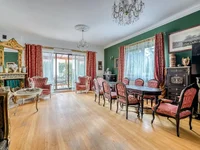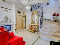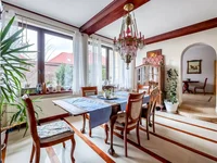 Au rez-de-chaussée, il y a un salon spacieux avec une cheminée en marbre et une sortie sur la terrasse. Il y a aussi un bureau, une cuisine avec un bel ensemble de cuisine et une sortie vers la salle à manger, un WC, un cellier et une chaufferie. Le garage intégré dispose de deux places de parking et d'une entrée directe à la maison. Au deuxième étage il y a une chambre principale avec une armoire et des fenêtres au nord, chambre II au sud, chambre III avec une fenêtre semi-circulaire et situé à l'ouest, et chambre IV avec des fenêtres de grenier et une mezzanine. Il y a aussi une salle de bains principale avec baignoire, deux lavabos, un miroir et une sortie sur la terrasse, une deuxième salle de bains avec douche et accès au grenier.