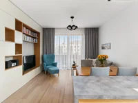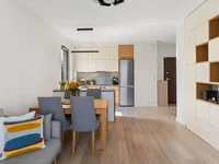 A l'intérieur : un salon avec une cuisine équipée d'appareils BOSH (réfrigérateur, four, lave-vaisselle, plaque de cuisson à induction) et une sortie vers un balcon de 7 mètres. Deux chambres séparées, dont un maître avec une armoire intégrée et une chambre pour enfants. Une salle de bains spacieuse avec une baignoire, un grand miroir et des armoires. Dans le couloir il y a une armoire intégrée, et dans la buanderie il y a une machine à laver et un sèche-linge. L'appartement est situé dans un complexe surveillé à partir de 2016, avec des panneaux solaires sur le toit.