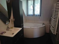 Au rez-de-chaussée il y a un escalier étroit, un long hall, une spacieuse chambre ensoleillée, un grand salon divisé en un salon et un coin télévision avec une sortie vers une grande terrasse, un bureau, une cuisine lumineuse et une grande salle de bains lumineuse.